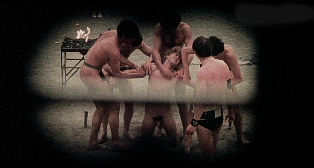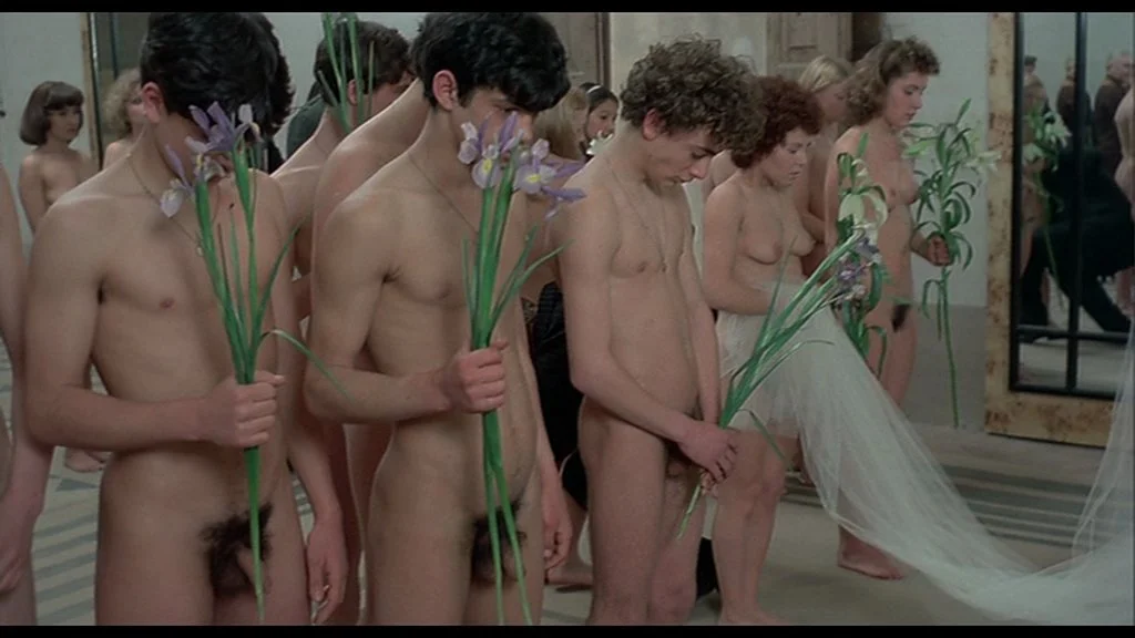 Þess vegna er myndin auðvitað bæði afar kaotísk (verk Sade eru það) og full af öfuguggahætti sem Sade taldi hið sanna eðli mannsins og í frásögn hans eru aðalpersónurnar ekki endilega þeir skúrkar sem þeir verða í útgáfu Pasolini. Fléttan snýst um að fjórir valdamiklir „frelsissinnar“ (libertínar) ræna unglingum annars vegar til að hjálpa sér að skipuleggja eins konar kúgunarorgíu og hins vegar til að halda þeim föngnum í 120 daga, pynta og niðurlægja, m.a. með því að láta ungmennin skríða nakin á fjórum fótum og leika hunda, keppa um glæsilegasta rassinn (sú keppni felst í því að allir lyfta berum afturhluta en eru með höfuðið hulið). Eitt par er látið „giftast“ og síðan látið afklæðast til að stunda kynlíf áður en þeim er báðum nauðgað af valdamönnunum. Brúðkaupið er síðan endurtekið með drenginn í brúðarkjól (sjá að ofan) og er það eitt fárra atriða myndarinnar þar sem allir eru í fötum. Öll fórnarlömb sem reyna að mögla eða mótmæla eru skrifaðir upp í svarta bók og bíða þeirra hræðileg örlög í lokin. Miðhluti myndarinnar (sá sem ég hef nú séð í fyrsta og síðasta sinn) fjallar aðallega um kúk og piss og hvernig þessir kúgarar láta fórnarlömb sín éta skít og éta líka sjálfir. Þetta er sannarlega frekar viðbjóðslegt þema, einnig sótt beint til markgreifans alræmda. Ég endurtók með sjálfum mér „leikmunir leikmunir“ meðan ég horfði á þann hluta til að kúgast ekki.