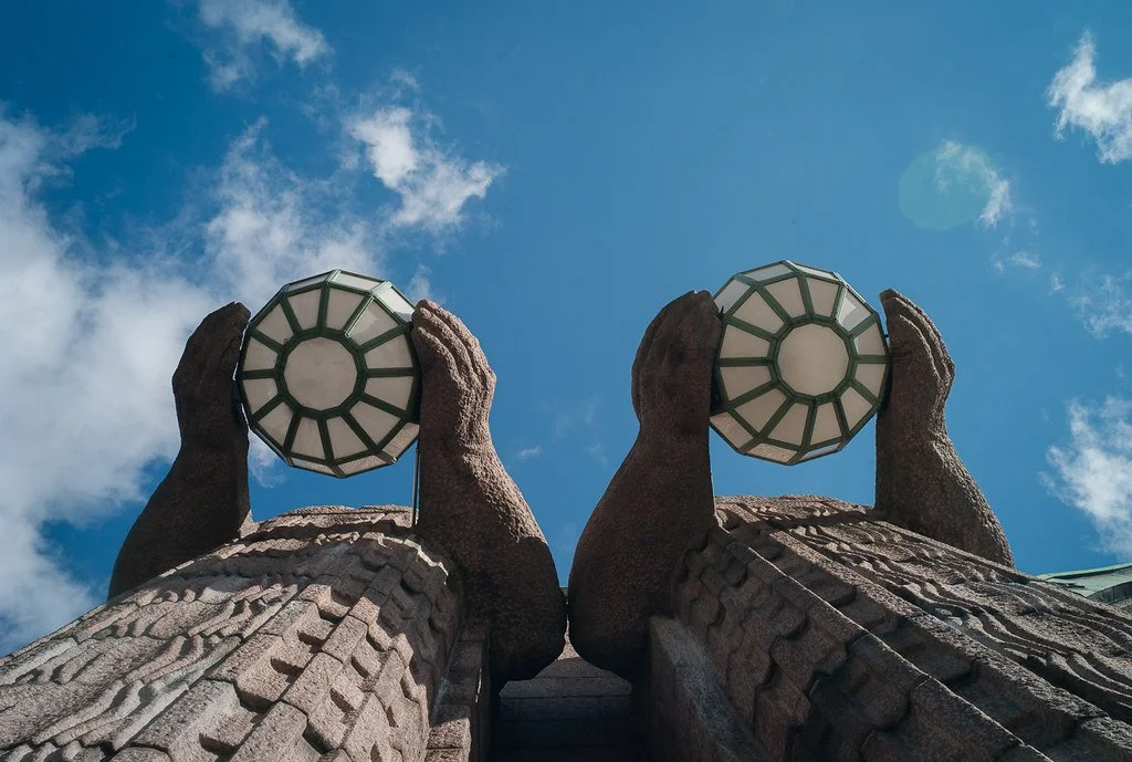 Sama ár og afi heitinn fæddist risu fjórar feiknlegar styttur við lestarstöðina í Helsinki en þær tröllslegu mannverur nefnast luktarberarnir eða lyhdynkantajat á frummálinu. Listamaðurinn Emil Wikström (1864-1942) var samtíðarmaður Einars Jónssonar og undir ýmsum sömu áhrifum en aldrei fékk Einar þó að gera aðra eins kólossusa fyrir íslenskt samfélag þó að heiðurslandinn Bertel Thorvaldsen hafi hannað risavaxið Luzern-ljónið snemma á 19. öld. Bertel vann auðvitað aldrei fyrir Íslendinga enda hafði hann líklega minni en engan áhuga á þeim bóndadurgum en allan á Grikkjum, Rómverjum og hetjum kristninnar. Samt var styttan af Bertel í miðbænum fyrsta íslenska útilistaverkið, að sjálfsögðu gefið af Dönum. Bertel er kannski sú íslenskasta af öllum okkar menningarhetjum þar sem hann kom aldrei til Íslands, hirti ekkert um land og þjóð en varð frægur erlendis alveg óháð löndum föður síns.