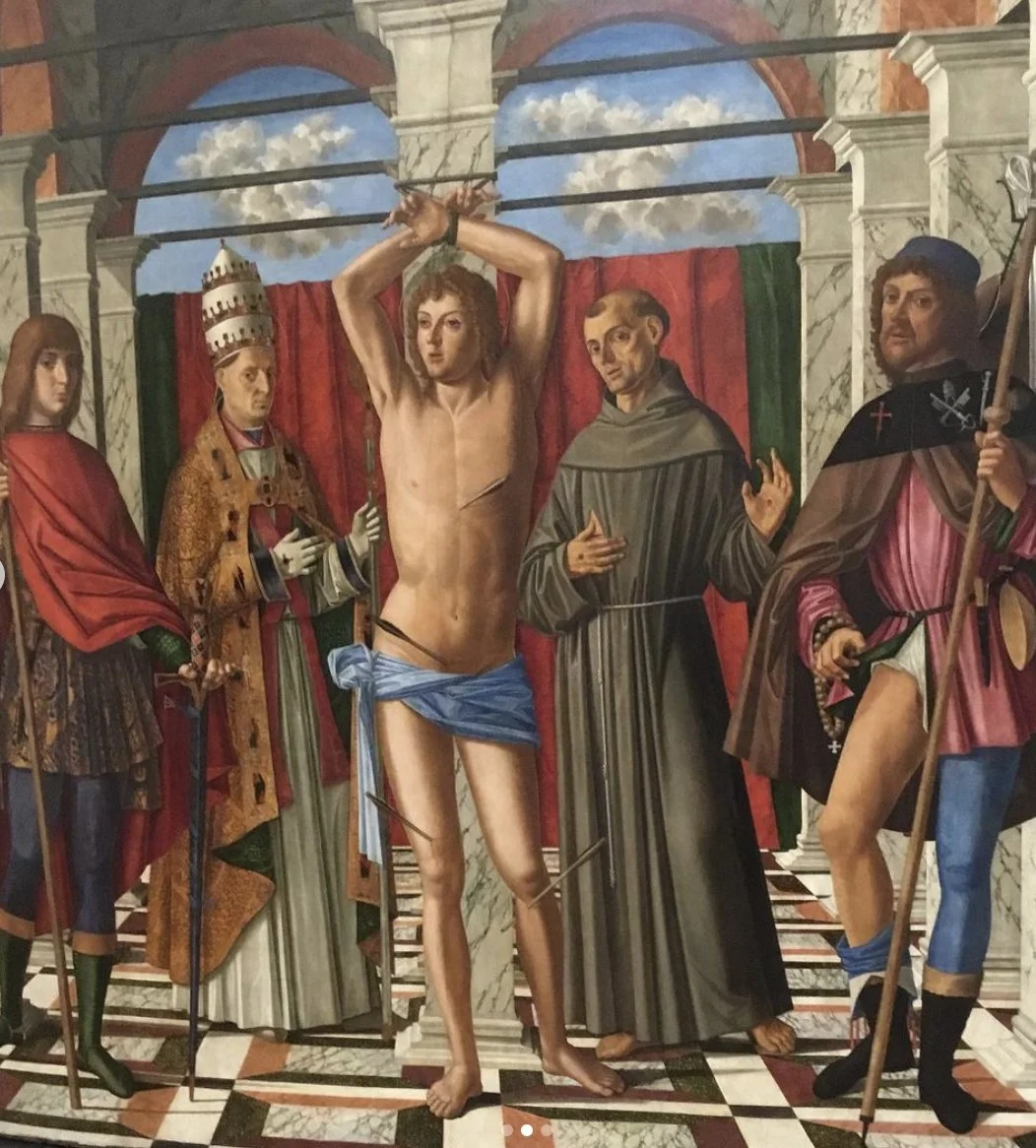 Ég sótti auðvitað heim listasöfn í fyrstu og einu Ítalíuferð minni árið 2019 og í einu slíku varð ég heillaður af vinsældum heilags Sebastians sem voru líklega mestar á 15. og 16. öld þó að hann hafi látið lífið á 3. öld eftir Krist. Hylli þessa tiltekna dýrlings virðist ekki síst stafa af því að Sebastian var ungur og stæltur karlmaður og hann varð t.d. vinsæll til áheita hjá íþróttamönnum. Síðmiðalda- og endurreisnarmálverk af dýrlingnum eru því mýmörg eða legio og eitt þeirra kemur við sögu í kaþólsku glæpasögunni minni Skollaleik sem var enda samin eftir Feneyjaferðina.