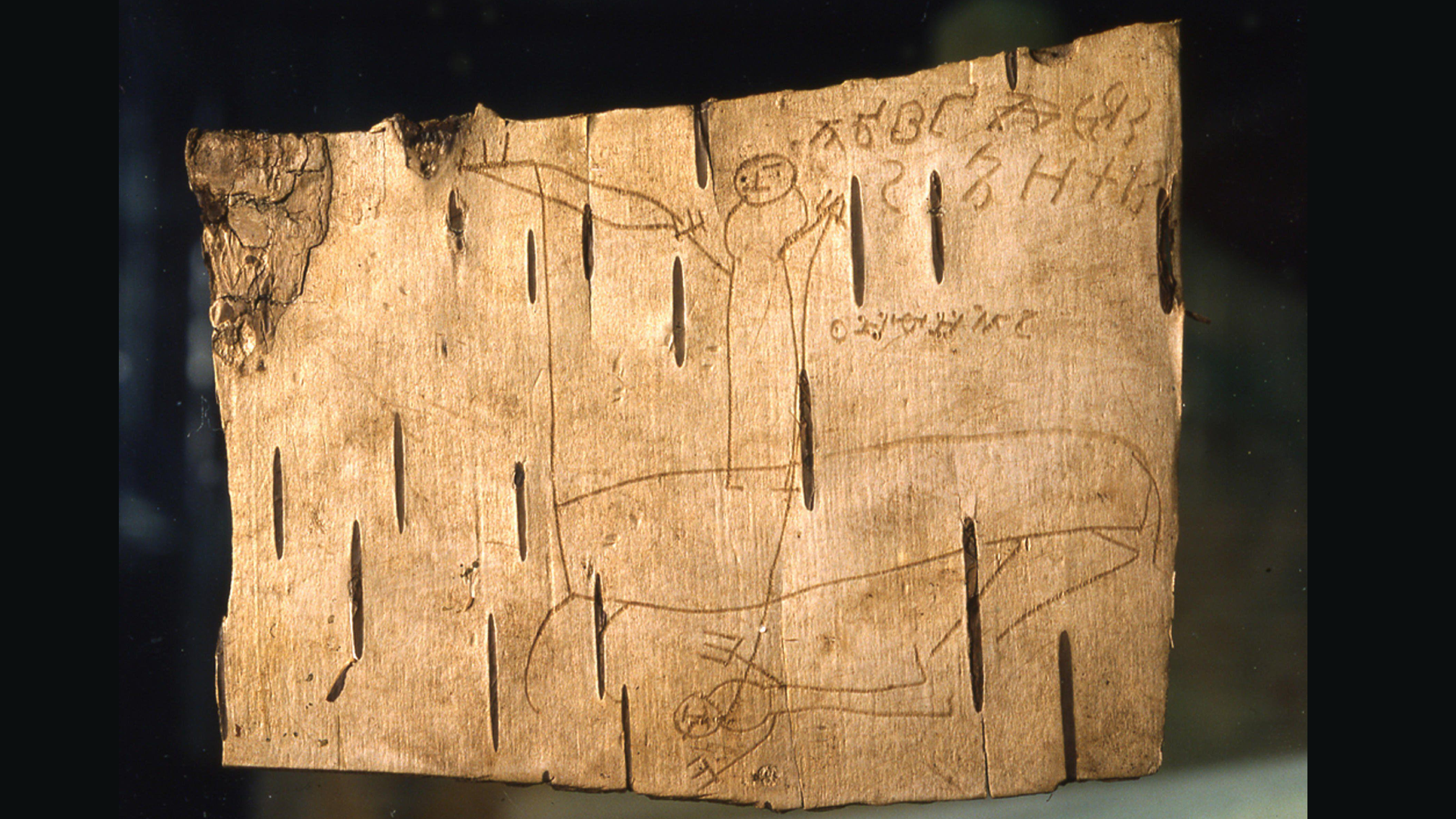 Það merkilega er að teikningar þessa 13. aldar Rússa eru ekki heldur ólíkar mínum eigin teikningum sjö öldum síðar. Eins er með þá aðferð að blanda saman texta og myndum því að ég gerði eins. Hinn óþekkti Onfim er því í raun alveg eins og ég mörgum öldum síðar, sjö ára drengur sem elskaði að teikna og átti nóga góða að til að fá að læra að skrifa og nota trjábörk til þess arna. Alls eru sautján berkir eignaðir honum. Tólf þeirra eru með teikningum en fimm aðeins með texta. Ein myndin er af riddara á hesti (sjá að neðan) og er merkt Onfim. Ef til vill sá strákurinn sjálfan sig sem riddara á hesti að stinga óvætti. Skriftin er augljóslega eins konar nám. Onfim skrifar stafrófið, endurtekur atkvæði og skrifar líka upp sálma, m.a. Davíðssálma. Hann skrifar á einum stað: „Herra, liðsinntu þjóni þínum Onfim.“